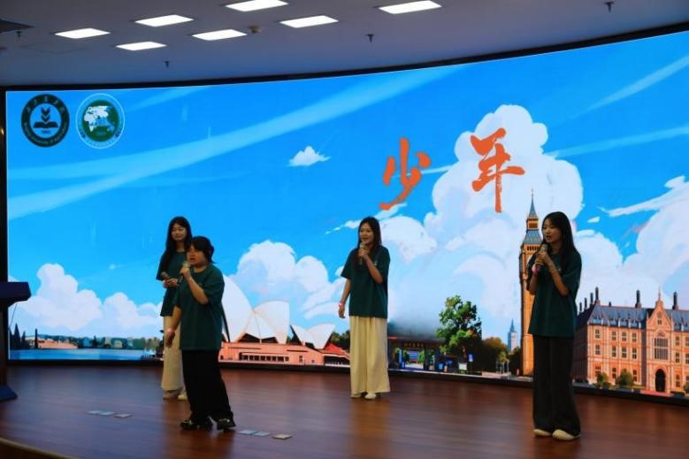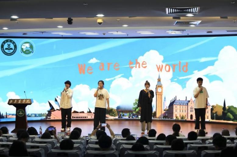 仪式中,同学们还表演了小合唱《我爱你,中国》《少年》,朗诵了原创诗《青春》,表达对祖国深厚的热爱和对未来无限的憧憬。特别惊艳的是,已在英国哈珀亚当斯和澳大利亚伊迪斯科文大学留学的2021级学长,发来视频和现场同学合唱了《We are the world》,涌动着对朋辈的关爱和传承。