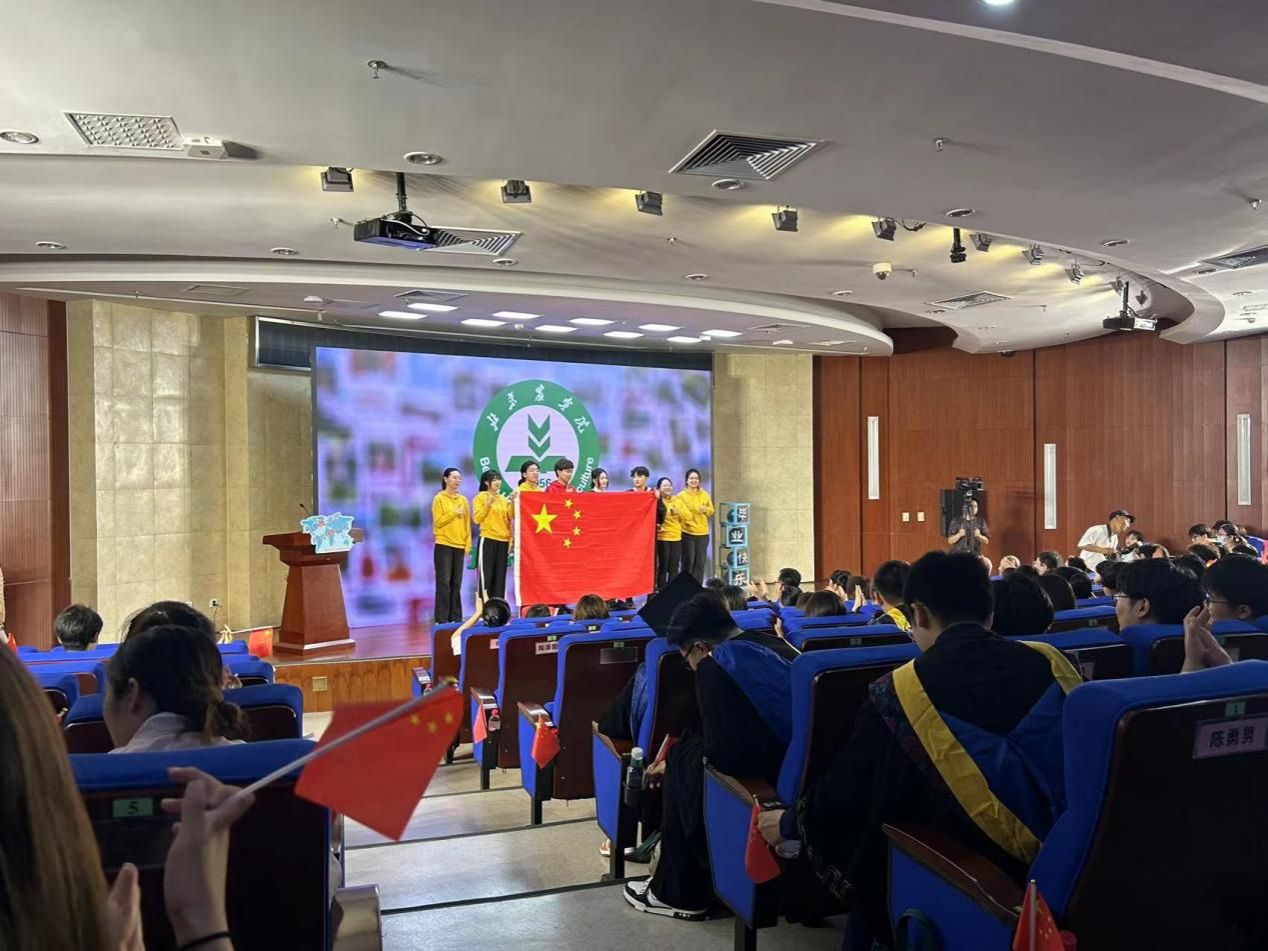 红旗飘扬,歌声悠长。6月16日下午,在图书馆报告厅举办的2023年出国留学启动仪式上,身着红、黄两色“国旗色”服装的歌手们唱响《我爱你 中国》。深情的歌词和员工歌手的热情演唱,使即将踏上留学征程的2020级同学瞬间共鸣,随旋律挥舞国旗,跟随节拍一起放声歌唱,一面面五星红旗汇成了美丽的红色海洋,一时间全场沸腾。当歌声停止,在舞台中央举起鲜艳的五星红旗时,出征在即的同学们的爱国情怀溢满心间。