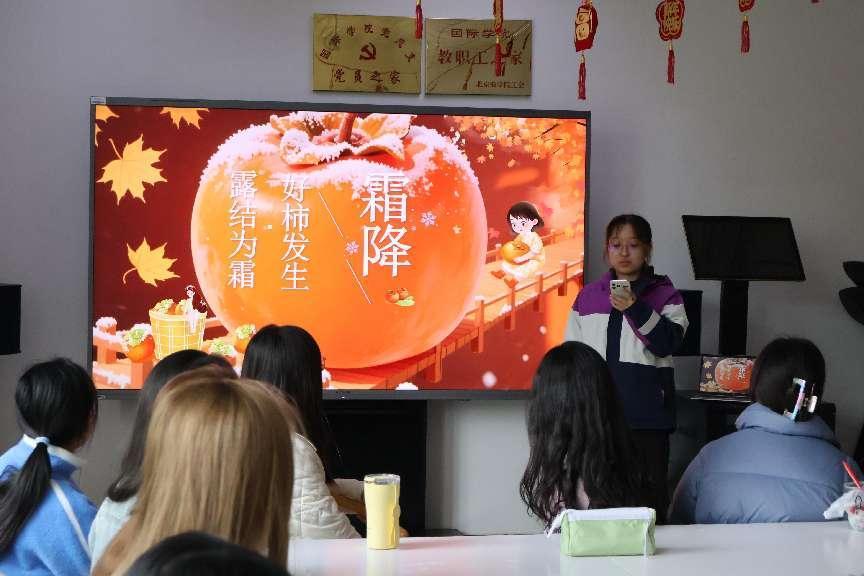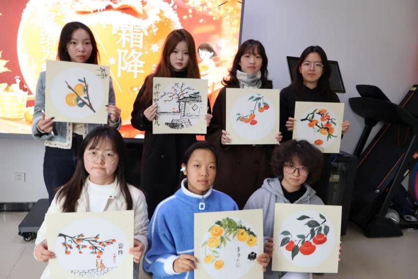 为着力打造沉浸式体验,活动还设置了两个互动环节:“节气知识竞答”通过气象特征、民俗典故等趣味题目,让同学们在抢答中掌握“霜降始霜”“南北方物候差异”等专业知识;艺术创作环节更成亮点,同学们书法临摹“柿柿如意”等吉祥语,用水彩技法绘制“丹柿图”,以笔墨丹青定格“霜叶红于二月花”的诗意。