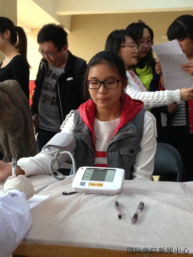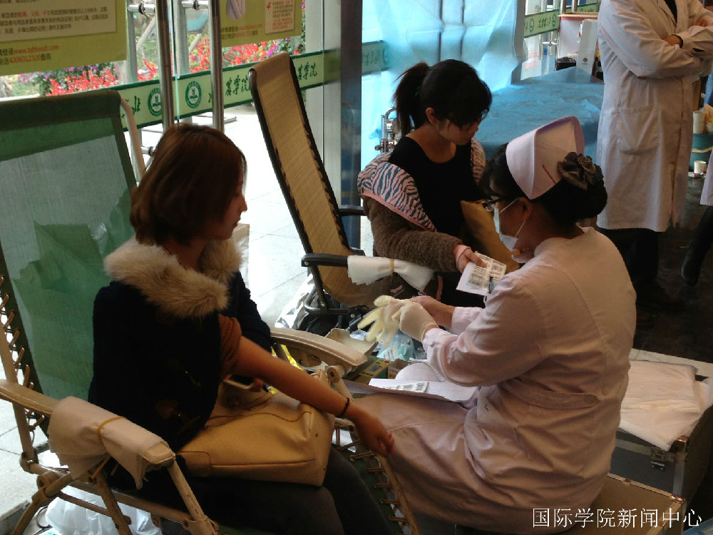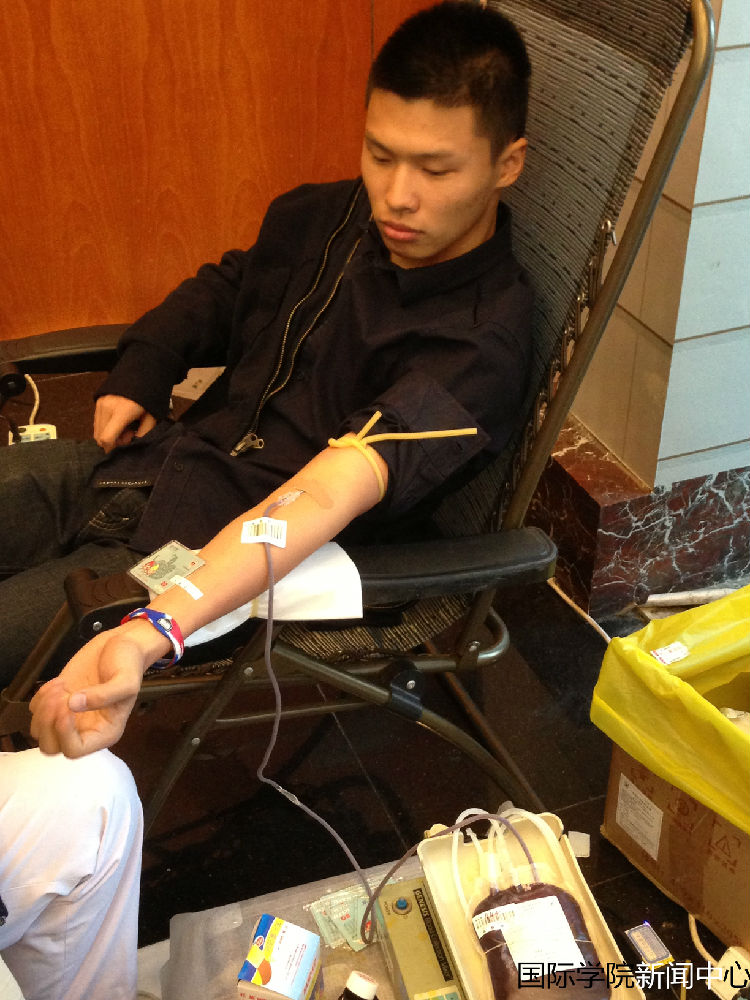 Students in International College participate in blood donation actively.The blood tests and physical examination was conducted at first.Next,students who Physical examination qualified conducted blood donation.There are many girls participating in the blood donation.They did not flinch when they see the blood needle which was many times thicker than usual needles. Girl Wang Xue who was the first time to join in blood donation activities said: "I feel very happy when I think that I just pain a moment, then it will help to deep suffering patients."The girl Hu Yingnan who fell head dizzy when she just finished donating blood but she said with a smile: "I'm okay, for a moment."