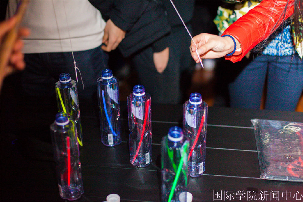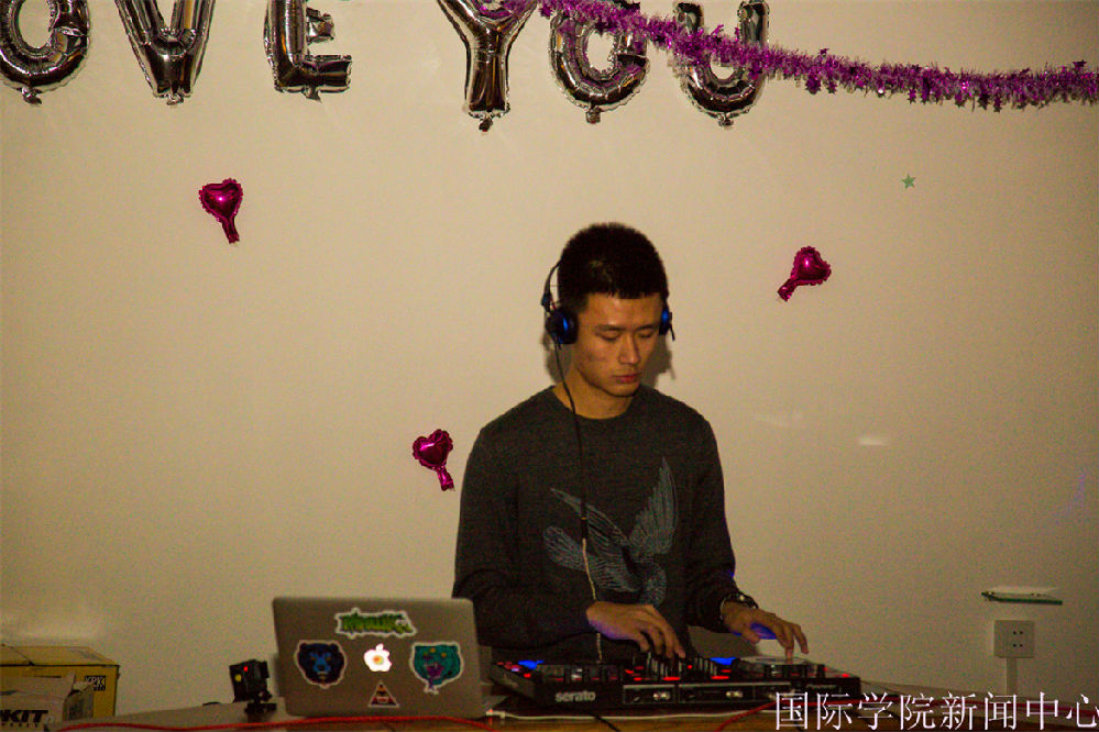 At 8:00p.m., this activity was beginning,all the students entrance in order with the ticket.This activity was divided in three parts:Games,DJ and Rest part. Niujia Pizza offered some delicious food, connected romantic lighting, and DJ music,it showed a wonderful atmosphere. The International students prepared some fruits, sweets and so on in the rest part. When the light was put off,the atmosphere more enthusiastic,all students wear rings on their hands,it just like stars in the sky,it made people feel magical .The game absolute attract people's eyes was balloon game, which put the atmosphere into top.Three college’s students played together,it showed the topic of this activity.