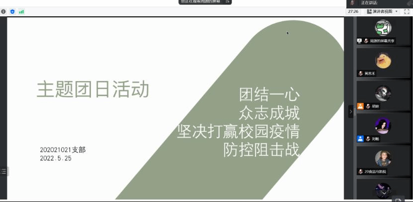 今天,团支部主持召开了抗疫主题团日活动,各位团员积极发言,表达了带头遵守防疫政策,坚决与疫情抗击到底的决心。