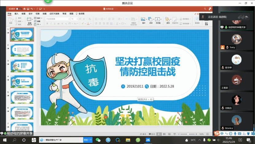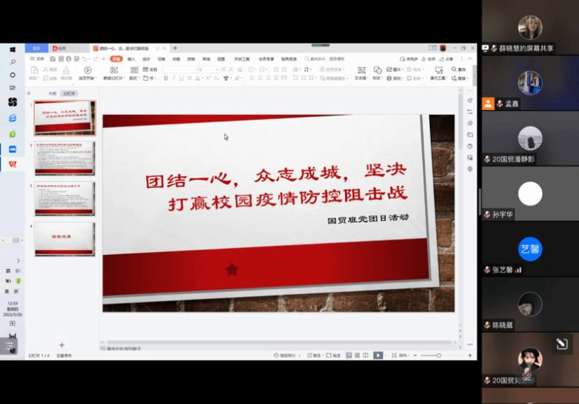 2022年5月23日起,在公司党委和上级团组织的领导下,betway西汉姆联官方网站团委有计划、分层次地组织各支部召开“团结一心,众志成城,坚决打赢校园疫情防控阻击战”主题团日活动,实现全覆盖,全员发言、表决心。一是认同国家防疫政策方针,坚定“四个自信”;二是认清全国和北京疫情形势;三是支持配合校园和社会防控措施,自觉做表率;四是发挥团员青年先锋队突击队作用,坚持打卡、做核酸、接种疫苗、不出校园、不外卖不网购。各团支部采用学习讨论、心得分享、经验共享、海报制作、短视频等多种方式进行开展。在线上会议中,同学们积极发言,展开讨论,深感团员责任之重大。