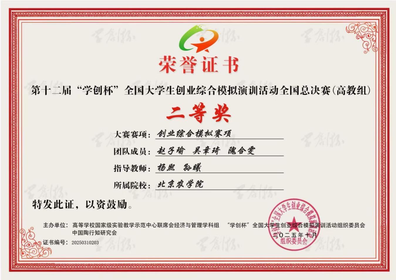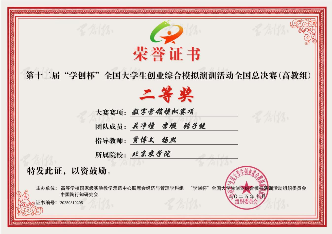在本次比赛中,betway西汉姆联官方网站师生表现优异。betway西汉姆联官方网站2023级农业资源与环境专业本科生李璇与智能科学与工程公司物联网工程专业本科生张子健组成的“值得信赖的”团队、betway西汉姆联官方网站2023级食品科学与工程专业本科生刘勇良、农业资源与环境专业本科生周赵璇与智能科学与工程公司2022级数据科学与大数据技术专业本科生于俊杰组成的“栗子鱼”团队,在betway西汉姆联官方网站教师贾博文、杨熙与智能科学与工程公司教师焦鹏的共同指导下,分别荣获数字营销模拟赛项全国二等奖。betway西汉姆联官方网站2023级农业资源与环境专业本科生赵子瑜、吴章琦和隗合雯组成的“7开得胜”团队,在betway西汉姆联官方网站教师孙曦、杨熙的悉心指导下,荣获创业综合模拟赛项全国二等奖。