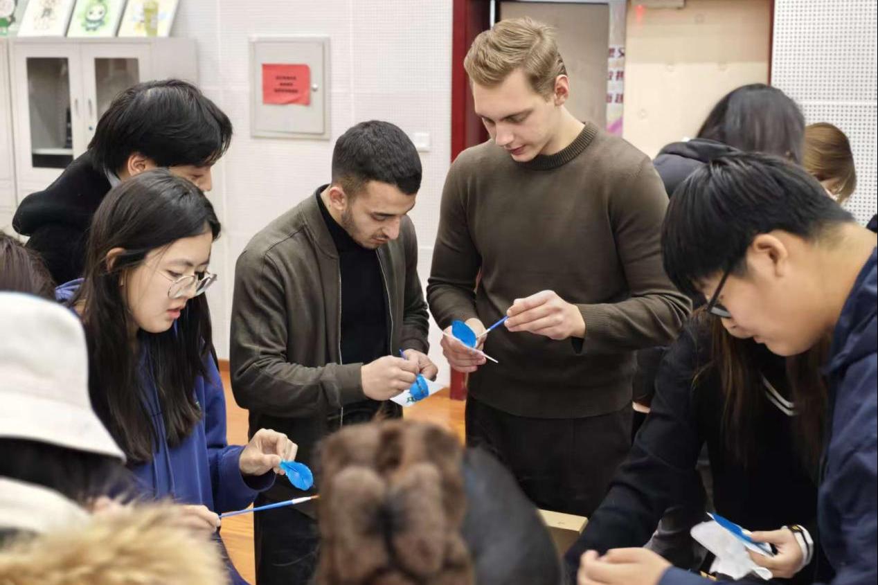 现场五大体验项目同步开启,共同构筑了一堂生动而深刻的“沉浸式文化课堂”。点翠体验区内,学子们手持仿翠羽材料,悉心粘贴于底胎之上,在一丝一缕间体味传统工艺的细腻与雅致;剪纸区域,红纸在指尖轻盈翻转,伴随着志愿者的耐心指导,“福”字与花鸟纹样渐次绽放,栩栩如生;串珠区则珠光流转,各国学子将缤纷彩珠一一串联,编织出既承古意又具个性的手链,也串起了跨越国界的情谊;投壶区不时传来阵阵欢呼,参与者凝神屏息,一投一掷间重现千年礼射之风;香囊区弥漫着清雅芬芳,艾草、丁香等天然香料被细心填入织囊,一针一线里缝入了温暖的冬日祝愿。在这场手与心相连的实践中,语言的隔阂悄然消融,文化的共鸣,正于指尖无声流淌。